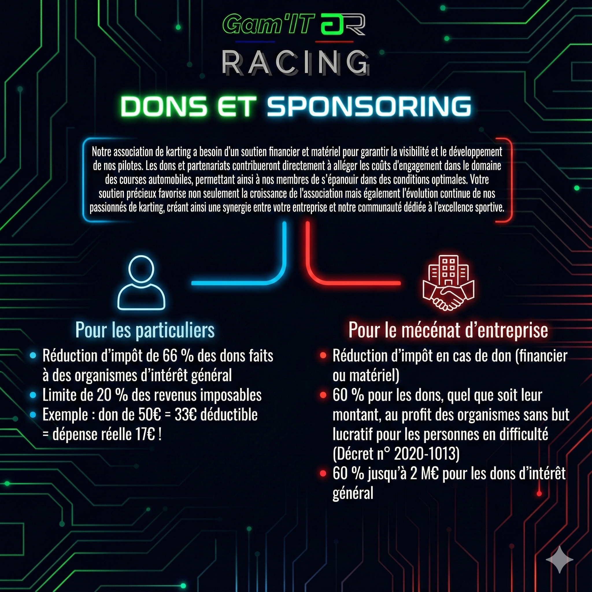 Notre association de karting a besoin d’un soutien financier et matériel pour garantir la visibilité et le développement de nos pilotes. Les dons et partenariats contribueront directement à alléger les coûts d’engagement dans le domaine des courses automobiles, permettant ainsi à nos membres de s’épanouir dans des conditions optimales.